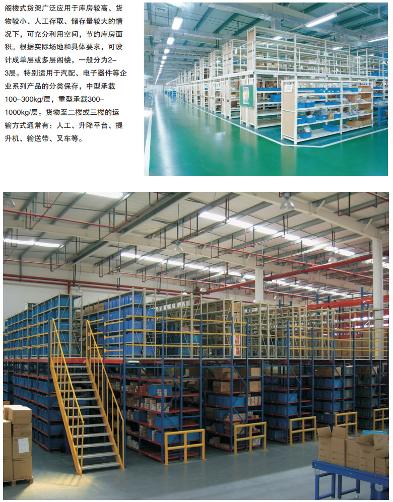 阁楼式货架系统是在已有的工作场地或货架上建一个中间阁楼,以增加存储空间,可做二、三层阁楼,宜存取一些轻泡及中小件货物,适于多品种大批量或多品种小批量货物,人工存取货物.货物通常由叉车、液压升降台或货梯送至二楼、三楼,再由轻型小车或液压托盘车送至某一位置。 近几年多使用冷轧型钢楼板,它具有承载能力强、整体性好、承载均匀性好、精度高、表面平整、易锁定等优势.有多种类型可选,并且易匹配照明系统,存取、管理均较为方便。单元货架每层载重量通常在500kg以内,楼层间距通常为2.2m~2.7m,顶层货架高度一般为2m左右,充分考虑工作人员操作的便利性。 楼层设计根据各种安装情况定制,可在现场轻松装配,无需焊接。阁楼货架系统在汽车零部件领域、汽车4S店、轻工、电子等行业有较多应用。