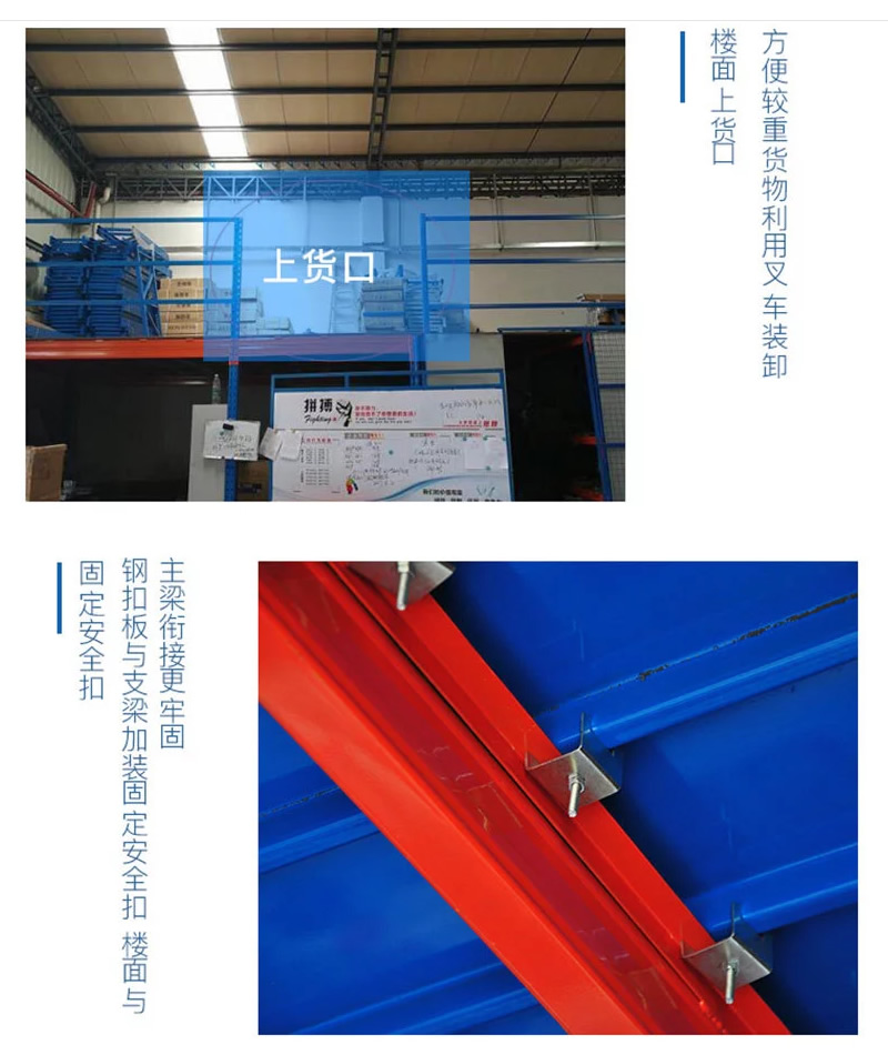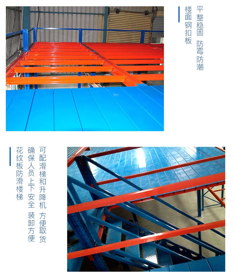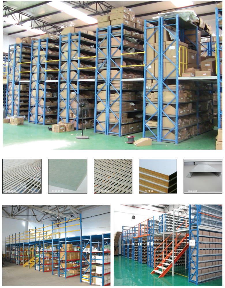 2、阁楼货架楼面铺设货架专用楼板,与花纹钢板或刚格栅相比层载能力强、整体性好、层载均匀、表面平整、易锁定等特点。