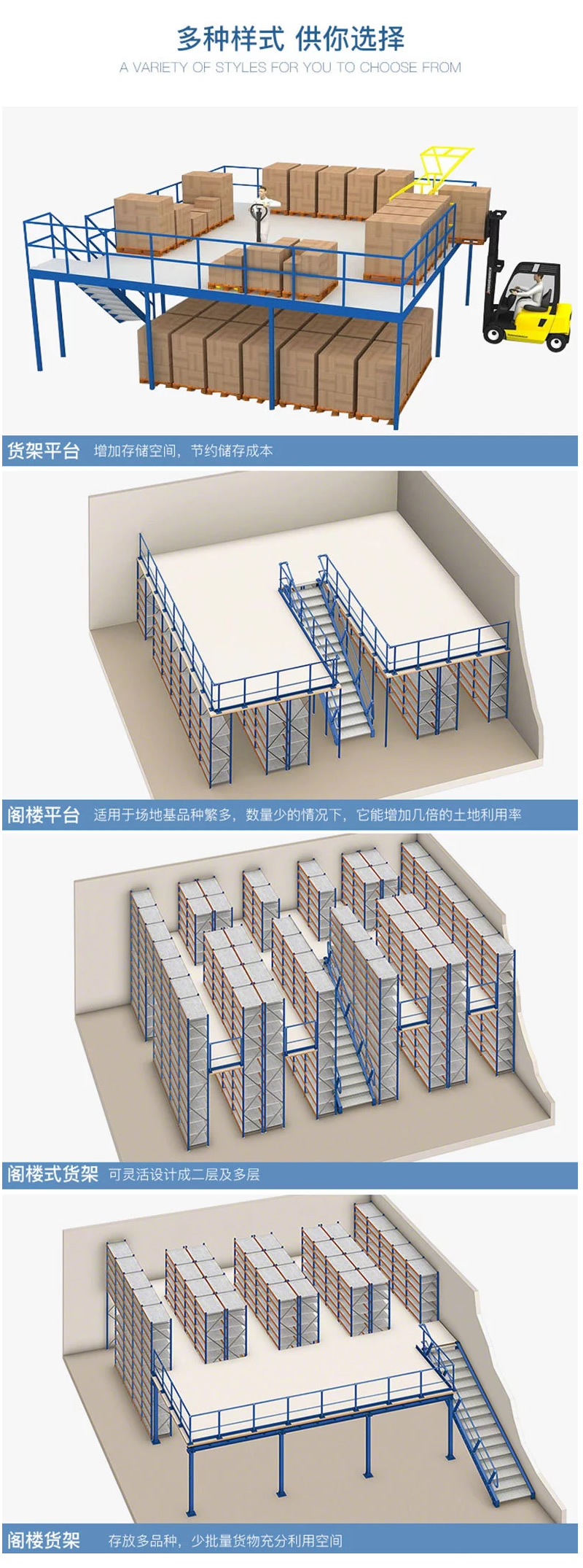 阁楼式货架面板有平板、花纹钢板、冲孔钢板等品种以适应防火、通风、光照等等不同使用要求。货物上下楼层可选择叉车、液压升降台、货梯等方式;货物同层运输通常使用小型手推车完成。
